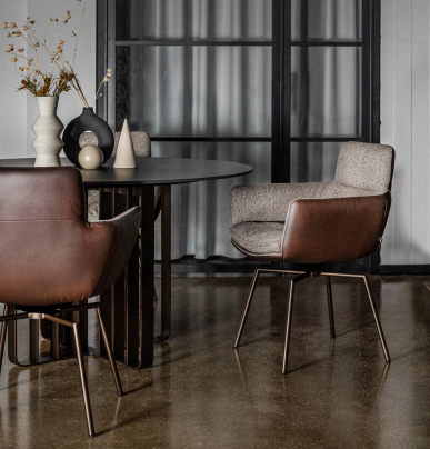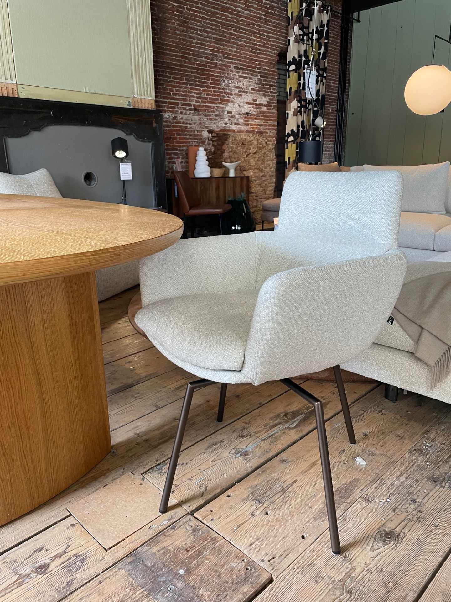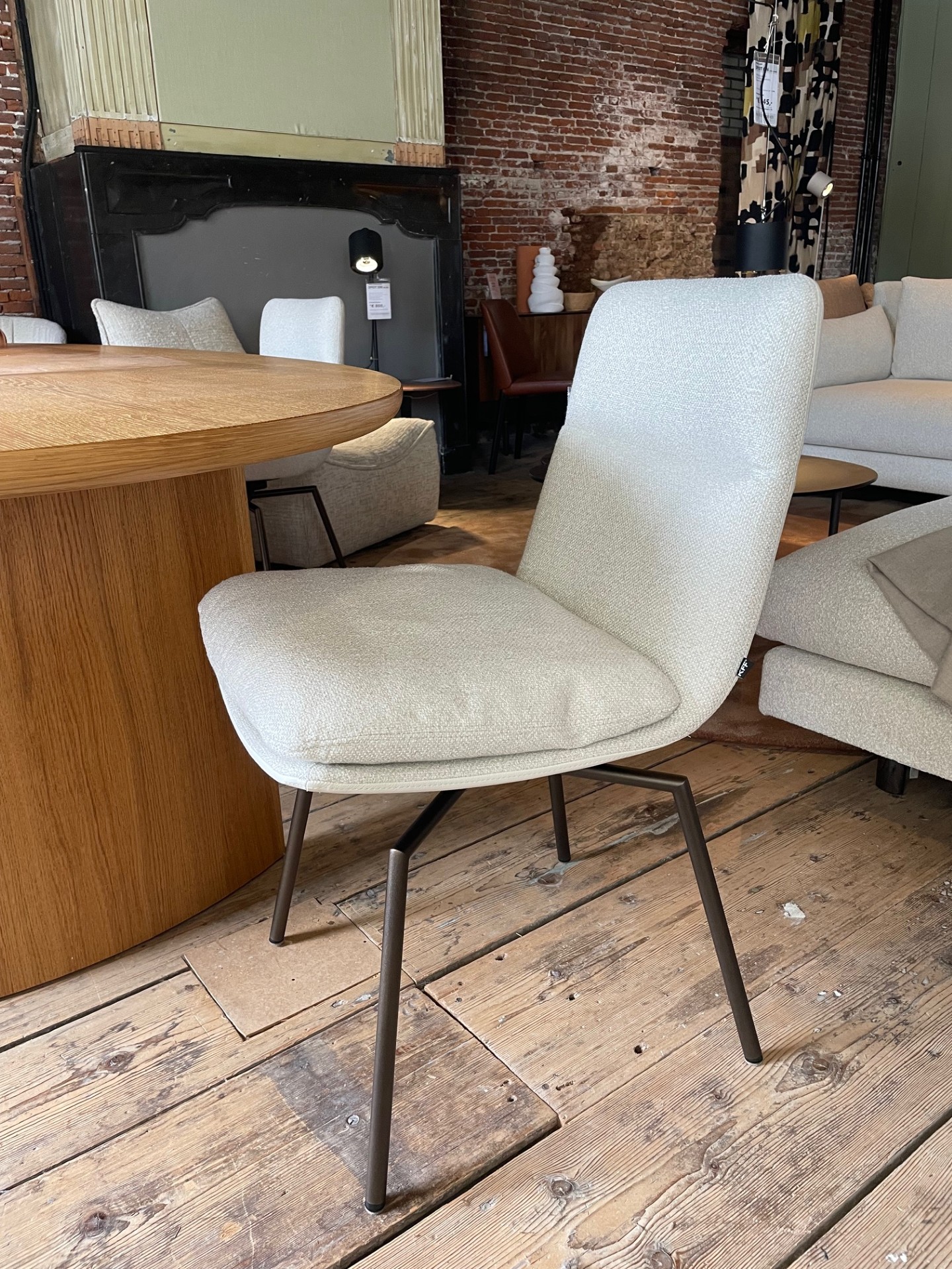 De FAYE stoel is een perfecte balans tussen strakke lijnen en verfijnde rondingen. De subtiele stiksels en lichte plooien zorgen voor een elegante, bijna sculpturale uitstraling. Dankzij de hoogwaardige stoffering biedt deze lichtgewicht stoel verrassend veel comfort – precies waar je het nodig hebt: in de rug, schouders en armen.