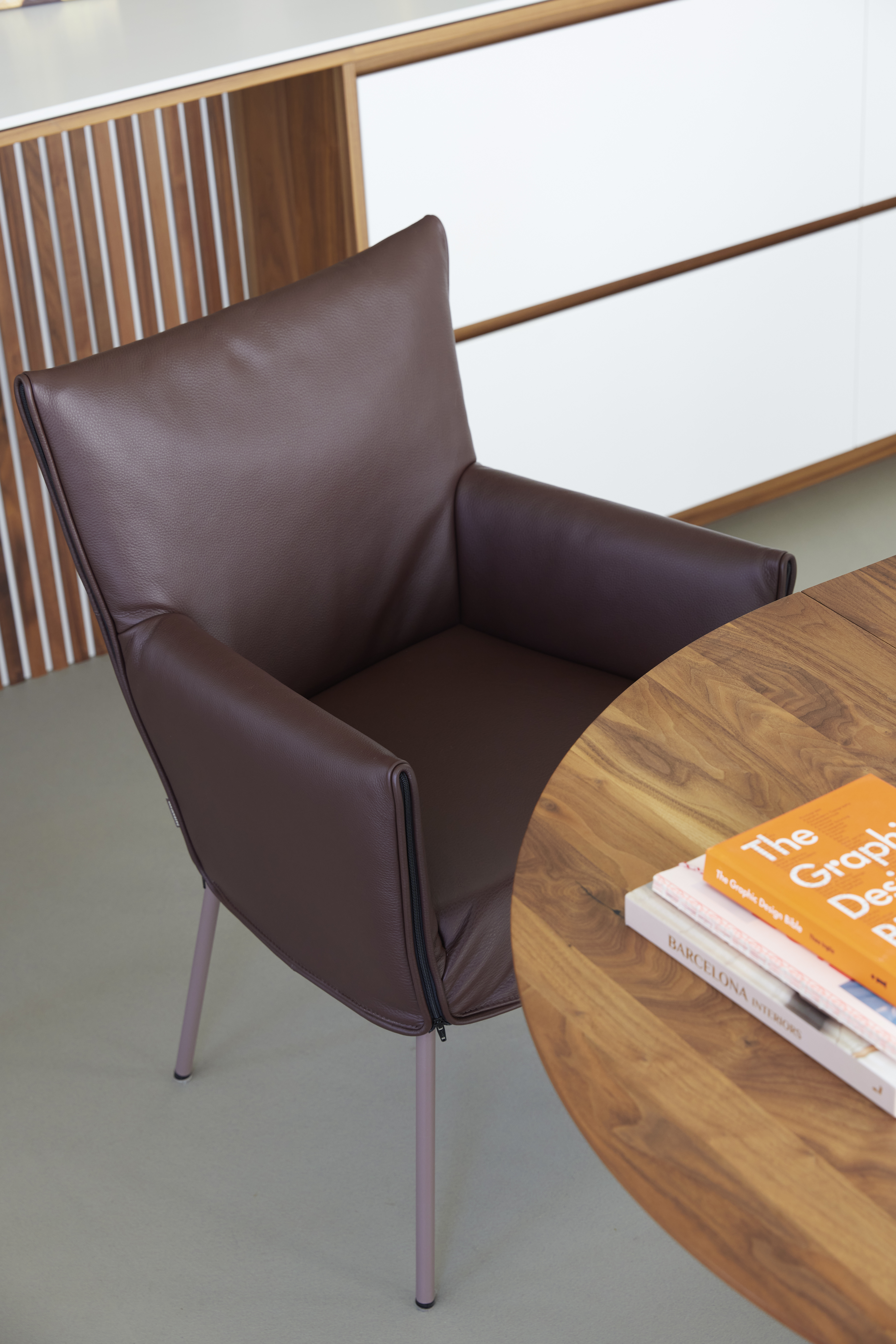 Hij voorzag het sobere ontwerp van een schitterend buisframe dat helemaal achter de rug doorloopt en stoere beklede armsteunen.